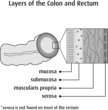 The mucosa is the inner lining of the colon and rectum. It is made up of: